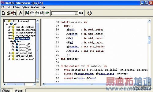 节点的名称可能令人陌生,因为它们是经过编译产生的,其功能在编译过程中可能已经改变了。RTL除错器则直接在原始代码中加入探测和触发点,在下面图一中,显示了一个经Synplicity的Identify RTL Debugger编译过的设计,其中所有可能被探测的节点都以小图示标记起来,点选其中一个节点会开启一份选单让人设定该节点是一个探测点、触发点、或者二者皆是,因为有维持住设计层级,很直觉就可以浏览设计以定位探测点。