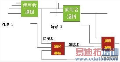 Identify RTLDebugger提供一个交互触发的功能,如下图三所示,可允许触发某时域内逻辑,去驱动和致能另一时域内的触发器。交互触发可用来检视跨时域事件的时序,藉由另一个更快时脉过度取样某时段,它亦可用来观看该时段内发生的事件。