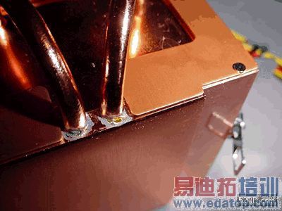 ▲热导管受热端(段)的近处拍摄,图中可见受热端与铜质平板相连(透过焊接),铜质平板部分再与处理器封装表面接触传导热能,其中封装与平板间也会使用上热导膏(或称:散热膏)使接触性热传导更快速。