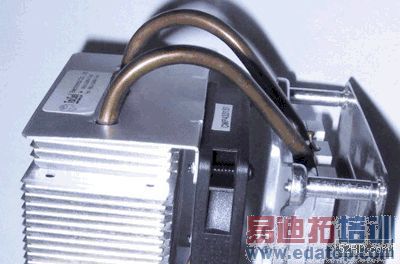 ▲「热导管+散热鳍片+电动风扇」已是常见的处理器散热作法,图中可见热导管将右处平板的热以弯管方式导往左处的散热鳍片,而平板与鳍片间的电动风扇则向散热片吹拂,将热气向外吹散。
