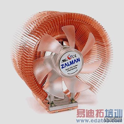 ▲另一款「热导管+散热鳍片+电动风扇」的合一性散热器,此一散热器运用弯管方式来增加热导管的整体长度,且散热鳍片方面用的是与导管一样的铜质,如此焊接时能有较高的密合,使热传导更快速。