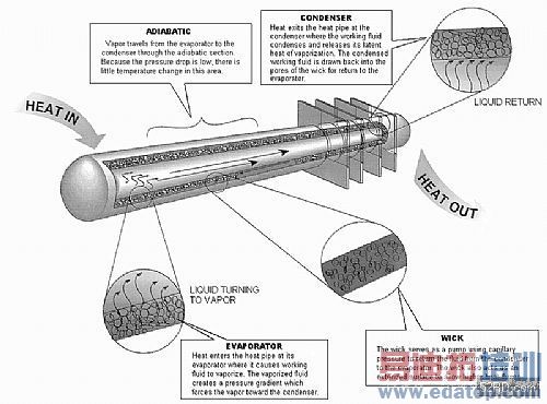▲图中为热导管的结构,左端为受热端,右端为散热端,右端散热端的外部装有散热鳍片以加速热的消散,管壁内则有毛细结构,可加速冷凝后的工作流体快速回流到受热端,而介于受热与散热间的一段则称为绝热段。