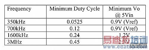 In this example, a 1.8V output can be generated with a 1.6 MHz switching frequency. However, if the frequency is 3MHz, the lowest possible output voltage is limited to 2.3 V and the DC/DC converter will skip pulses. The alternative is to lower the input voltage or reduce the frequency. It is a good idea to check the DC/DC converter datasheet for a guaranteed minimum controllable on-time before selecting a switching frequency.