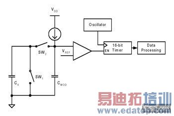 感测电容器CX与电流源都连接至一个类比多工汇流排上,其中电流源决定了感测电容器中充电的速率。而该电容器两端电位差会随着充电电荷累积到汇流排而产生线性增长,其关系式为q=CV。