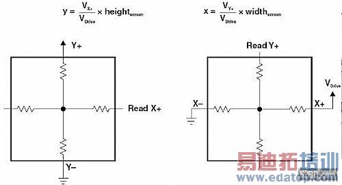 1.计算Y坐标,在Y+电极施加驱动电压Vdrive,Y-电极接地,X+做为引出端测量得到接触点的电压,由于ITO层均匀导电,触点电压与Vdrive电压之比等于触点Y坐标与屏高度之比。