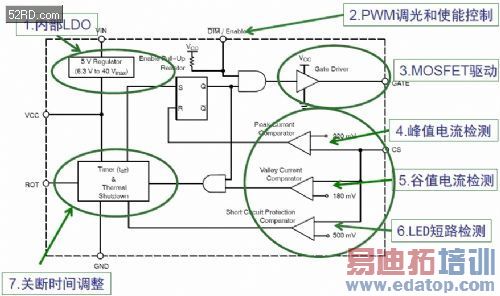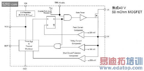 图3是NCL30161内部框图,它由7个部分组成:内部LDO部分把输入的高电压变为5 V稳压,为内部逻辑供电,包括外部MOSFET的驱动;PWM调光和使能控制部分;MOSFET驱动部分;内部比较器峰值电流检测部分,比较电压为220 mV;谷值电流检测,内部设定在180 mV;LED短路检测;关断时间调整。