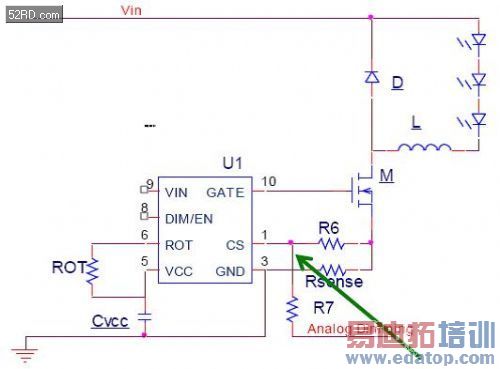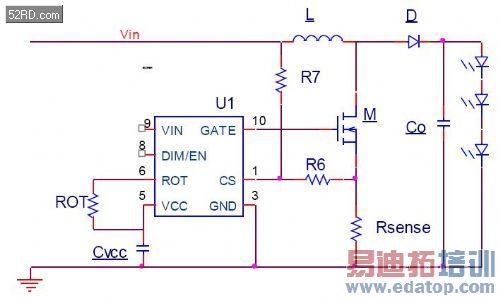 图2是NCL30161的典型应用降压LED驱动器的框图。可以看到,LED直接连接到输入电压,电流通过连接到地端的RSENSE设置;PWM调光和使能控制通过芯片的DIM/Enable脚实现;ROT用来设置初始关断时间。