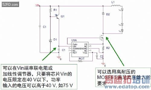 如果应用的输入电压范围超过芯片的40 V耐压,在要扩展输入电压范围时,可以在Vin端串联电阻或增加线性调节器,图9中使用了一个三极管、一个稳压管和一个电阻,将芯片Vin的电压限定在40 V以下为芯片Vin供电;功率输入部分的电压可以高于40 V,如75 V,如图9。这时,可以选用高耐压的MOSFET来满足高压输入的要求。