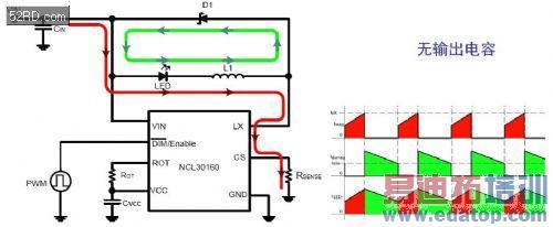 在图4中右侧可以看到NCL30161的典型电流波形,红色为MOSFET开通时的电流路径;绿色为MOSFET关断时的电流路径;右侧最下面是LED电流波形,可以看到它是连续的,且纹波电流在±10%以内。