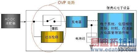 根据YD/T 1591-2006标准,手机侧充电控制电路应具备过压保护装置,也就是在手机充电接口导入直流6 V以上电压时,如果不能保证安全充电,应启动保护,在非预期电压的情况下,不应出现过热、燃烧、爆炸以及其它电路损坏的现象,而且恢复后,手机应能正常工作。如图4所示,过压保护(OVP)电路在检测到过压故障状况时,检测电路就会将开关打开,使电子负载与电源断开,从而使得包括微处理器、射频、存储器和电源管理器件等核心芯片遭受过压损伤。