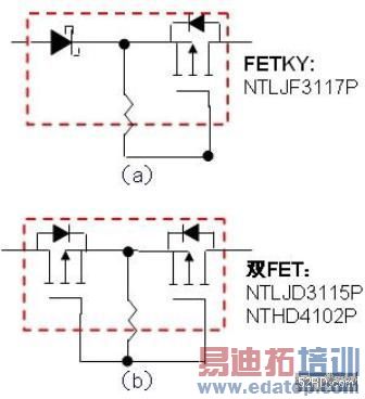 而在另一方面,通过用具有低V CE(Sat)的晶体管或者具有低Rds(on)的MOSFET代替肖特基二极管,可以降低传输元件上的压降,从而符合所需要的有限电压裕量要求。例如,双FET用作充电功率元件(如图3(b)所示)就是一个更加合适的选择。在这方面,安森美半导体的NTLJD3115P和NTHD4102P就是非常适合的选择。其中,NTLJD3115P是一款-20 V、-4.1 A、μCool? 双P沟道功率MOSFET,它采用2×2 mm的WDFN封装,具有极低的导通阻抗,其0.8 mm的高度也使其非常适合纤薄的应用环境;它针对便携设备中的电池和负载管理应用进行了优化,适合于锂离子电池充电和保护电路应用及高端负载开关应用。而NTHD4102P是一款-20 V、-4.1 A双P沟道ChipFETTM功率MOSFET,同样具有较小的占位面积和极低的导通阻抗,适合于纤薄的便携应用环境。