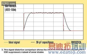 另外,许多新型消费电子器件能执行快速的IEEE-1394/1394b(Fireware)数据转换协议。这种非常高的数据速率(1600 Mbps,1394b)要求低电容ESD抑制器,例如聚合物浪涌器件(图 2c)。测试数据表明,聚合物ESD抑制器带来的信号失真比硅二极管器件保护Firewire端口产生的更少(图 3)。