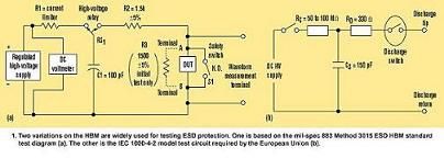 最流行的HBM变种是国际电工委员会IEC1000-4-2标准,定义为150pF电容通过一个330Ω电阻放电(图1b)。这是欧盟对在其区域内商品销售所必须的国际测试。