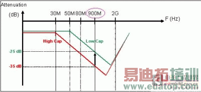 不过设计者知道,在滤波电容值与GSM/CDMA频率上的衰减特性之间存在着无法解决的折衷问题。低电容结构会影响滤波器的高频性能,且目前大多数低电容滤波器都不能在900MHz频率上提供优于-25dB的衰减性能。图2显示了EMI滤波电容对GSM频率衰减的影响。