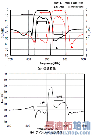 举例来说,图1所示的是BAND5(800MHz )收发双工器(产品尺寸2.5×2.0×0.6mm)的传输特性以及隔离度。一般的隔离度和过滤性的损耗是相互制约的关系,但本产品对于Tx频段能实现60dB的高隔离度,同时使Rx损耗维持在1.8dB。