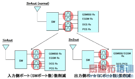在手机的高频率无线通信电路中使用的表面波滤波器,分为CDMA收发用的级间滤波器和GSM用的TOP滤波器等。村田的滤波器不仅具有低损耗和高抑制度的电特性,还由小型、薄型的各种产品尺寸构成了丰富的商品线,可以对应各种电路设计的需求。例如, 在多频段发展的高频无线通信电路中,为了减小电路基板上的贴装面积,将两个频带的单滤波器(产品尺寸1.35×1.05×0.5mm)合二为一,制造出了双滤波器(产品尺寸1.8×1.35×0.5mm)。此外还运用特殊的技术制造许多独特的商品,如将双层滤波器的输入端合并为一个的1in4out产品,以及将平衡器的输出端合并为一的2in2out产品等。通过共用输入端可以节省原本用于分频的开关(SW)。同时,共用平衡输出端可以使连接滤波器的高频IC的端口数目减少(图3)。这是在表面波滤波器的设计中通过调整阻抗和相位等方法,从而使差分端口实现共用。这些滤波器可以在多频带化发展的高频无线电路中,为外围电路的简化及电路整体的小型化做出贡献。今后村田制作所将继续致力于研发更小型化和高性能化,同时又具有输入端以及输出端共用功能的单滤波器、双滤波器产品。
