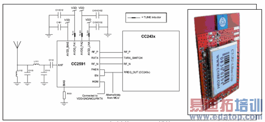 对于ZIGBEE通讯距离的扩展,目前采用外部扩展和内部增加放大器两套办法,TI最近推出的CC2591放大器芯片,就是比较典型的外部扩展的办法,CC2591能够和CC2430等ZIGBEE单芯片完整结合,以非常低的成本,实现ZIGBEE通讯距离的扩展,图一是CC2591原理和采用CC2591CC+2430设计的EZ-Lbee模块系列产品。