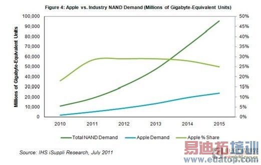 2011年苹果各类产品对NAND闪存的需求预计将达到52亿颗(以1Gb 颗粒计),而总体市场是185亿颗。苹果在该市场占28.3%的份额,是最大的NAND闪存买家。