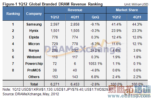 从最新的第一季DRAM营收做市占率分析,美光与尔必达轮流位居第三与第四名,市占率各为11.6%及12.4%,与位居第二的韩系厂SK海力士(首季营收市占23.9%)仍有显著差距。经由这次美光整并尔必达后,综合两家公司的市占率,泛美光集团可望一跃逼近24%,高过SK海力士(23.9%),成为仅次三星成为市占率第二的内存品牌厂,有如TrendForce一直重申的论点,DRAM产业于今年可正式走向寡占市场,三大DRAM阵营已俨然成形,有助于DRAM颗粒价格逐步走向健康面,避免以往动辄削价竞争的市场态势。