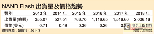 以1GB为基准计算的NAND Flash出货量,2013年为355.07亿颗,2014年增加48.6%至527.51亿颗,2015年预计为766.7亿颗、2016年为1,116.65亿颗、2017年为1,516.6亿颗、2018年为2,036.16亿颗等。