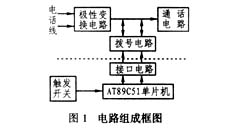 该远程自动报警系统的电路组成框图如图1所示。图中虚线以上是普通电话机的极性变换、拨号电路和通话电路,虚线以下部分为信号检测和单片机控制电路。该电路采用AT89C51(也可使用AT89C2051)单片机作为主控制器,并配合电话机的存贮拨号电话、适当的接口和控制软件来实现自动报警。具体的连接电路如图2所示。从图中可以看出,该电路主要由AT89C51、5个RY5D-K继电器和带有存贮拨号功能的电话机组成。电路中的开关K为报警触发开关,K的一端接AT89C51的P1.6脚。当无报警信号时,P1.6处于高电平。电路工作时,CPU不断检查P1.6的状态,当触发开头被触发时(按下),P1.6由高电平变为低电平,当CPU检测到P1.6为低电平时,为了防止虚报,CPU自动延迟25ms,再检P1.6的状态,若仍为低电平,则CPU使P1.4输出低电平,并通过继电器J4自动接通电话机的免提键(也可接在柄的触点处,后面再作说明)。接着通过J1、J2、和J3分别接通“RECALL”键、存贮拨号地址键“1”和电话机拨号键“1”,以将存贮在电话机中的BP机号码自动拨发出去,当系统收到传呼台的回音信号后,报警系统又自动拨出一个“111111”的告警标志数字信息,然后自动挂机。拨发告警标志数字信息是为了区别报警传呼和普通传呼。