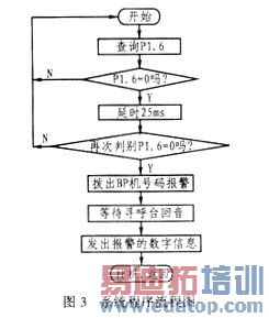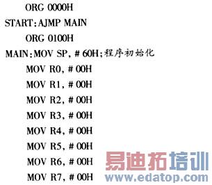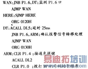 系统程序的设计并不复杂,主要是控制5个继电器的适时工作,即控制P1.0~P1.2、P1.4和P1.5电平的高低。主程序的流程框图如图3所示。该程序包括6个延时子程序。这6个延迟子程序的功能如下:DL0(延时400ms)用于按键接通;DL1(延时800ms)与DL2(延时1.2s)用于按键接通之间的间隔;DL3(延时2.8s)是由10(或11)位电话号码的快速发号时间确定的,双音频电话的单频持续时间为120ms,位间隔时间为108ms,10位号码的持续时间为120×10+108×9=2.172s(11位为2.4s),这里取2.8s,以保证单片机开始判断时拨号已结束,从而有效防止判断错误;DL4(延时9s)是由拨号结束到收到传呼回音所需的时间决定的,当发完BP机号码后,约8s后可以收到传呼台的回音信号,所以取9~10s即可保证收到传呼台的回音信号。当收到传呼台的回音后,系统自动发出告警标志数字信息“111111”后挂机(断开J4的触点);DL5(延时25ms)用于按键去抖动,以防止虚报警。实验程序清单如下: