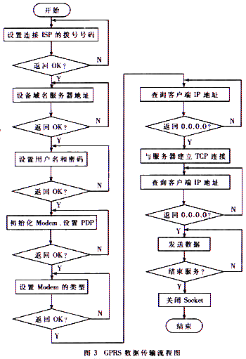 与传统的GSM相比,GPRS通信的特点是终端可移动、接入时间短、传输速度快、按流量计费、可接入Internet网、时时在线[2]等。GPRS网络使用TCP/IP协议栈进行组网,可以实现与Internet网络的无缝连接,但是在传输时数据格式应该符合TCP/IP协议栈的数据包格式。GPRS网络为实现点对点通讯,在数据链路层上使用PPP协议,物理层上使用串口通信。因此,实现基于GPRS的数据传输系统时需要对数据进行打包,并需要在数据链路层上实现PPP协议[3]。基于TCP/IP专用模块的GPRS远程数据传输的流程如图3所示。
