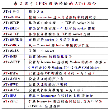 基于TCP/IP专用模块的移动终端主要由数据获取模块(数据采集卡)、数据打包模块和数据发送模块组成。数据打包模块采用ConnectOne公司生产的Iconnector模块,数据发送模块采用SIEMENS公司生产的具有GPRS功能的GSM手机模块MC35。在Iconnector内部的Flash中存储有Internet协议栈,支持PPP、IP、UDP、TCP、DNS、SMTP、POP3、HTTP、FTP、Telnet等几乎所有的网络协议。通过AT+i指令设置并控制Iconnector,以实现数据的打包。Iconnector有两个标准的RS-232串行接口,在标有Modem字样的一端与MC35相连接,在另外标有Device字样的一端与数据采集卡相连接。用于GPRS数据传输的AT+i指令如表2所示。