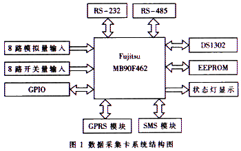 根据智能家居系统在线设备比较多的特点和方便控制的需求,数据采集卡应具有足够的输入、输出接口和远程通信功能。基于MB90F462的数据采集卡的系统结构如图1所示。系统按功能可分为以下几个模块:8路模拟量输入;8路数字量输入;GSM短信数据传输;RS-232、RS-485通信;GPRS数据传输;实时时钟;状态指示;EEPROM数据存储。