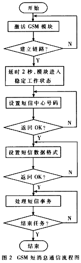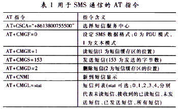 在进行短信通信之前,通过在/IGT管脚输出一电压下降沿激活GSM模块,待模块稳定之后,设置短信服务中心号码和数据格式,并进行短信收发、删除、查询等操作。GSM的短消息程序设计流程如图2所示,用于SMS通信的AT指令如表1所示。