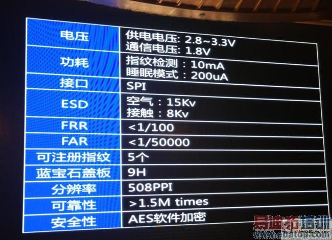 如图,是汇顶的指纹识别模组具体参数,特别提到的是它的认假率小于1/50000,难怪现场体验的朋友,几乎没有发生失误的现象。其实,我在测试的时候,还故意换着指头测试,当然换了指头就显示是错误输入了。不过,昨日有朋友在昌旭的微博中指出,汇顶的算法还是基于AES的软件加密,没有苹果的硬件加密安全,不知这个问题汇顶如何回答?我还没有去追答案。