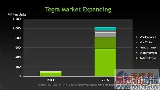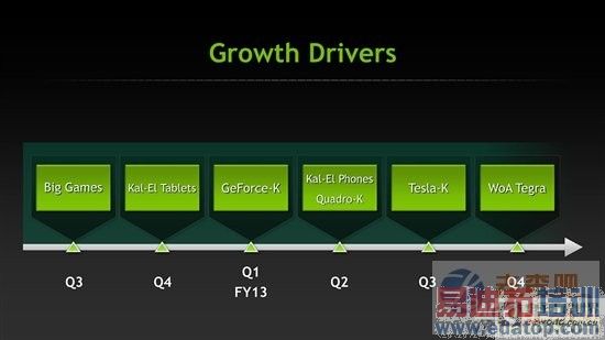 还是先让我们回到上周末Kepler的情报汇总里面:NVIDIA 2011年9月财报会议上的一张幻灯片里面的"WoA Tegra"(目标为Windows on ARM的Tegra)就是下一代开发代号为"Wayne"的SoC处理器。预计将于2013财季第四季度,即2012年底2013年初正式面世。