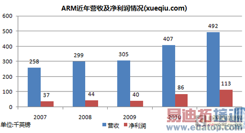 ARM是全球领先的半导体知识产权(IP)商,公司设计高性能、廉价、耗能低的RISC处理器方案,并将其授权给第三方合作伙伴,第三方合作生产基于ARM架构芯片,ARM则按芯片价格与出货量获得一次性授权入门费与版税提成,2011年营收7.85亿美元,同比增21%,税前利润3.67亿美元,同比增37%。