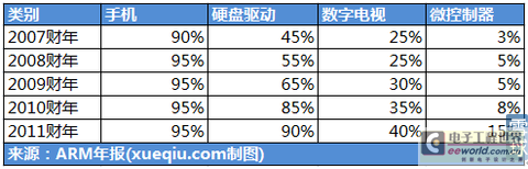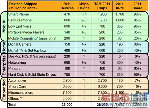 2011年智能手机出货4.7亿部,ARM架构芯片占90%,功能手机出货6.6亿部,ARM架构芯片占95%,硬盘和固态驱动器出货7亿,ARM占90%,数码相机1.5亿台,ARM占80%,打印机1亿部,ARM占65%份额,数字电视和机顶盒4亿台,ARM占40%份额,另外还包括网关路由器、智能卡等领域占据一定市场份额。
