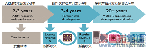 接下来我们简单的介绍下ARM处理器的设计及授权周期,ARM主要做的是高效率、低功耗芯片(微处理器)架构研究开发,通常2-3年的周期,这也是ARM成本产生阶段,然后选择ARM为合作伙伴的公司支付一笔入门的授权费获得设计方案,并基于ARM方案开发自己的产品,通常周期3-4年,再然后当合作伙伴的芯片开始出货时,ARM能够从每一片基于其架构的芯片获得1-2%的版税,而每一款ARM设计方案都适应于多种终端应用,每一种应用又能获得多年的版税现金流,规模效应显著。