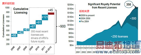 ARM的每一个授权协议都代表着未来的版税收入,即授权协议是ARM营收的基础,2012年上边年95%的版税收入来自2008年及之前的授权协议,2009年、2010年、2011年以及2012年上半年合计签订授权协议350家,目前总协议大约900份。授权协议增长主要来自现有客户升级ARM架构处理器、进入新领域或者新客户首次使用ARM架构授权,2009年至今签订的350份授权协议将驱动ARM未来的版税收入。