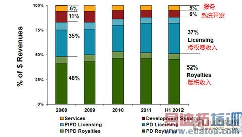 我们从前文的商业模式中分析可知,ARM收入主要来自授权费与版税,如下图所示,2011财年上半年ARM收入中52%来自版税收入,37%来自授权费收入、6%来自系统开发、5%来自服务,版税收入比例由2008财年的48%上升至52%左右。
