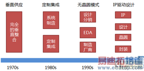 ARM的发展代表了半导体行业某种趋势,即从完全的垂直整合到深度的专业化分工,70年代半导体行业普遍采用上中下游的垂直整合封闭式生产体系,80年代开始半导体行业开始分化,出现垂直整合和分工化的系统制造、定制集成等两个体系,台积电的晶圆代工模式进一步推动了专业分工的发展,半导体行业分工进一步细化,形成IP、设计、晶圆、封装价上下游体系,ARM处于价值链顶端。