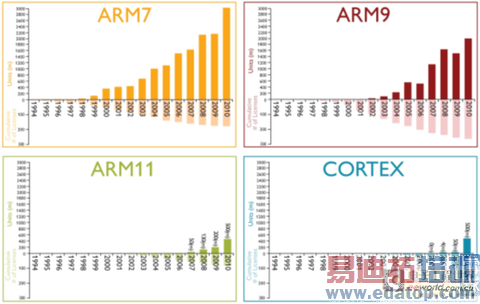 进入2000年,开始受益于手机以及其他电子产品的迅速普及,ARM系列芯片呈爆炸性增长,2001年11月出货量累积突破十亿片,2011年基于ARM系列芯片单年出货79亿片,年营收4.92亿英镑(合7.85亿美元),净利润1.13亿英镑。