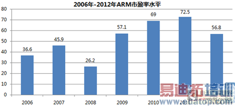 2009财年、2010财年、2011财年ARM营收分别为3.05亿英镑、4.07亿英镑、4.92亿英镑,年复合增长率约27%,主要受益于智能手机的迅速渗透,同期净利润由4000万英镑增长至1.13亿英镑,年复合增长率约68%,大幅高于营收增速,杠杆效应较高。