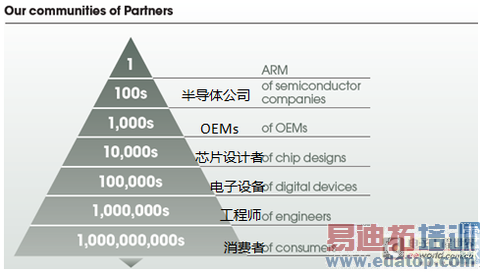 下图是ARM构建的生态简单示意图,我们可以看出ARM通过研发开发模式将OEMs/芯片设计/工程师/消费者涵盖在自己的生态范围,从公司到工程师到产品产生较高的转换成本和依赖(现在ARM架构成为很多大学通信专业的必修课)。