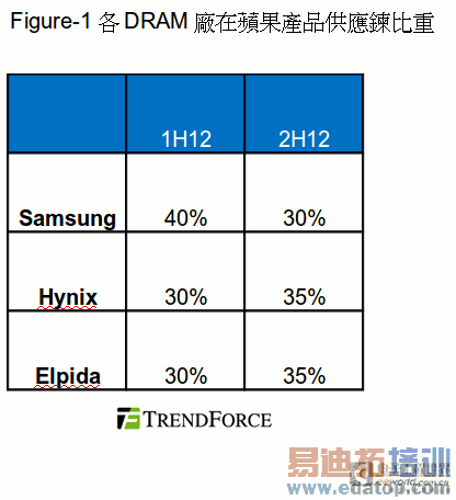 September 9, 2012---苹果供应炼去三星化成为市场焦点。根据TrendForce旗下研究部门DRAMeXchange调查,在美国记忆体大厂美光(Micron)并购日本厂商尔必达(Elpida)之后,全球DRAM与NAND Flash市场有了新的局面,苹果已经提高对非三星体系厂商的DRAM采购量。在美国重新强化制造产业的当下,销售成绩甚佳的美国苹果公司(Apple),与南韩三星(Samsung)在平板电脑、智慧型手机市场的专利战短兵相接,日前美国法院已经做出三星败诉的判决,但双方的专利诉讼战还没有结束,可以确定的是双方在供应炼方面已经有生变的迹象。