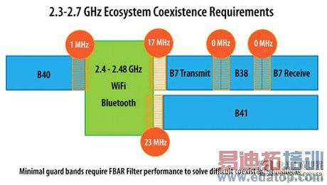 欧洲主要LTE部署频带之一Band 7的要求提供了FBAR滤波器技术如何改善智能手机运作的例子,2600MHz的Band 7紧邻欧洲WiFi服务频率的上缘,WiFi是一个经常和4G/LTE同时运作的服务,如使用智能手机作为Wifi热点。如果没有卓越的滤波能力,WiFi收发器就可能会被Band 7上的LTE信号传输遮断或干扰。Avago的ACMD-6107双工器提供了足够的保护,就算是在最接近的最高WiFi频道工作也不会受到干扰,其他竞争滤波器技术无法有效提供需要的带外衰减能力,因此可能造成较高频率的WiFi频道无法使用,和Avago的ACPF-7124 WiFi共存滤波器配套,这个组合可以带来无与伦比的性能,满足甚至超越系统的要求。