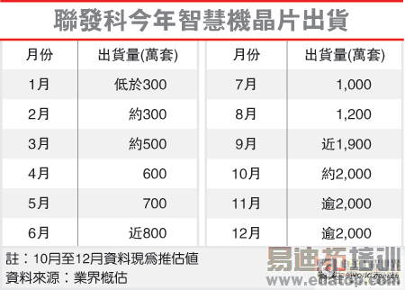 手机晶片供应链预估,联发科智慧型手机晶片10月出货量若能顺利跨过2,000万套大关,加上11月和12月站稳在2,000万套以上,将使第4季出货量轻松超越6,000万套。
