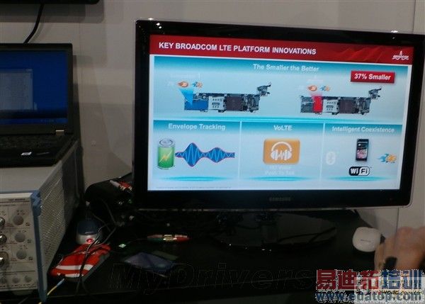 博通拒绝披露其LTE基带的具体型号和规格,比如支持3GPP Release、UE LTE Category的哪个版本,不过展示了一张对比图,声称其面积要比iPhone 5里的高通MDM9x15、RTR8600(收发器)组合小了35%,还支持驱动智能功率放大的包络追踪(Envelope Tracking),以及与无线芯片的智能共存。