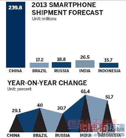 今年稍早,市场研究机构 Canalys 预测,中国将在2013年进一步巩固其全球最大智能手机市场地位,年度智能手机销售量估计可达2.4亿支,几乎占据全球出货量的三分之一;至于排名全球第二大智能手机市场的美国,同时间智能手机出货量约1.25亿支。