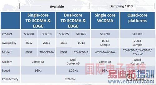 展讯通信目前的产品矩阵中包括对应TD/EDGE的SC8810/SC6820,主要覆盖智能低端入门机型,SC8825/SC6825为前者的升级版,主频到1.2GHz,采用双核。另外2013年上半年WCDMA/四核产品出于sampling阶段。