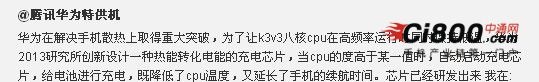 据@腾讯华为特供机透露,华为海思八核已经研发出来,而这颗芯片在解决手机散热上取得重大突破,为了让k3v3八核cpu在高频率运行时同时保持低温,华为2013研究所创新设计一种热能转化电能的充电芯片,当cpu的度高于某一值时,自动启动充电芯片,给电池进行充电,既降低了cpu温度,又延长了手机的续航时间。