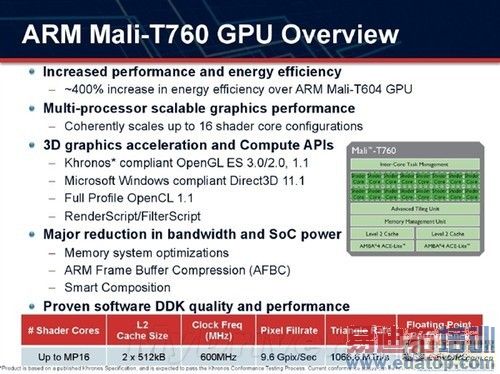 不久前,ARM在其全球性的技术大会发布了新一代Mali产品:专注于中低端市场的T720,和针对高端市场研发的T760。值得一提的是,T760是ARM首款最多能够做到16核Mali的GPU产品,与上代T604相比,T760在降低功耗方面的能力提升了四倍。