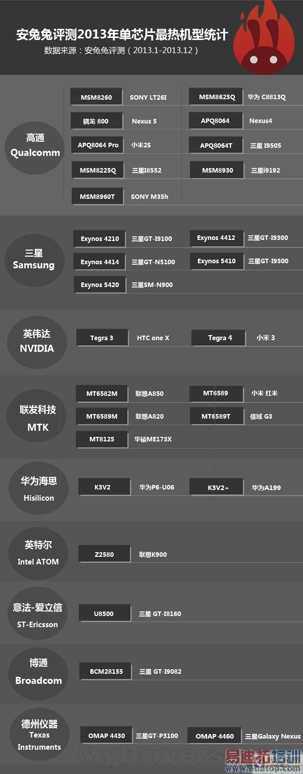 安卓的世界里不但有大量的手机厂商,还有众多芯片厂商,他们是智能手机最核心的力量。2013年结束了,哪些芯片厂商最热门?谁比谁更受欢迎?安兔兔通过对数据库中数百万份测试样品进行分析,的处理器一个有趣的排行榜。